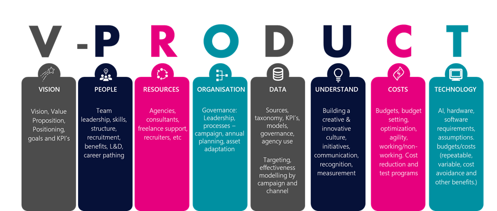 At Flock, we create integrated and holistic change programs using our V-PRODUCT framework below. The framework captures all the fundamental aspects of the marketing operating model and allows us to orchestrate workstreams of change to build better more effective and efficient marketing models.